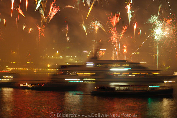 Explosionen, Schüsse, Knaller Nachtlichter um Mitternacht, Illumination Neues Jahr Grüsse, Hamburger Touristikzentrum am Wasserfluss. Elba new year image river shipping in harbor