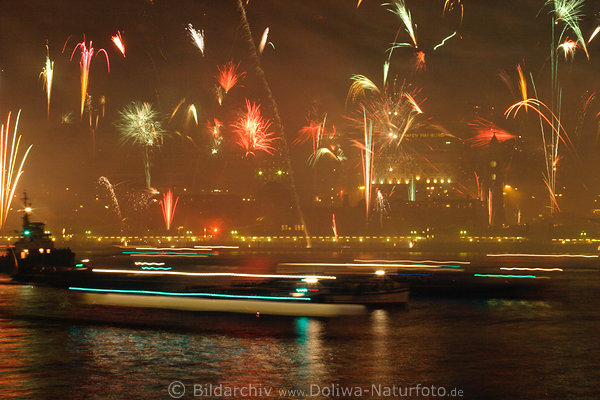 Landungsbrücken Freude am Neuen Jahr, Mitternacht Explosionen, Schüsse, Knaller in Luft, Schiffe in Fahrt, Hafenstadt bunte Licht am Touristikzentrum