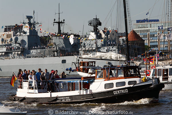 Hafenbesucher an Schlepper Boot vor Marineschiff auf Elbe Hamburger Schiffsparade maritimes Bild in Elbwasser Hansestadt Hafenfest Urlaub Reiseangebot