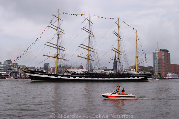 Viermast-Segler Schiffsriese Segelschiff bei Schiffsparade in Hansestadt Hamburg begleitet von Motorboot “Greif 1”, Yachtschiff in Fahrt bei Hafengeburtstag Parade vor Baumwall auf Elbe und Hafenstadt Blick am Wasser