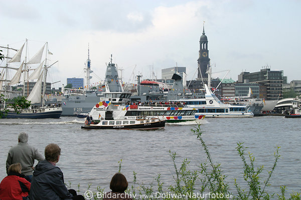 vor Michel an Elbe, Hamburg Landungsbrücken, Parade der Schiffe auf Elbewasser, Segelschiff Segler, Militär Kreuzer Schiff, Motorboote, Touristikboote auf Elbe, Hafenstadt Bildarchiv, Reiseführer Ausflug-Tip