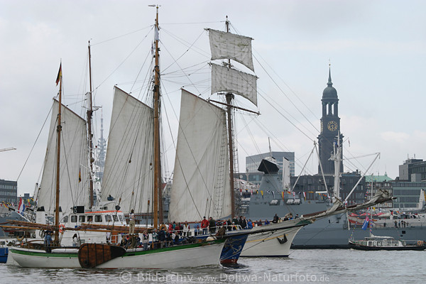 Kirche über Elbe Hafenblick zwischen Landungsbrücken & Baumwall, Barkasse Boot vor Kriegsschiff im Hamburger Hafen in Elbe Wasser, Segelboote in Hafenstadt Bildarchiv Fotografie