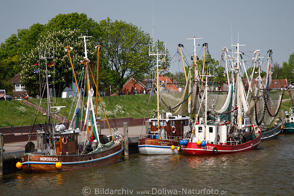 Fischer Schiffe im Sielhafen, Krabbenkuttern Fischereiflotte im Hafenbild, Ferienort der Gemeinde Krummhörn an Nordsee an Leybucht & Greetsieler Nacken. Niedersachsen Reiseangebot & Ausflugstip, Kurztrip ans Norddeutschland Wattenmeer