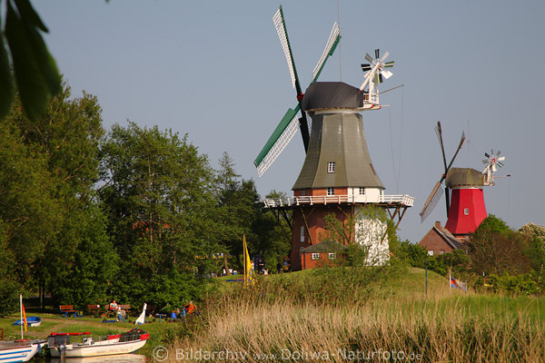 graue Windmühle mit Museum, Ostfriesland Windmühlen Paar über Bootsanleger, Nordsee Krummhörn Greetsieler Nacken am Wattenmeer Landschaftsfoto, Attraktion professionell Bild, Fotografie an Leybucht, Niedersachsen Urlaubsausflug Reisetip