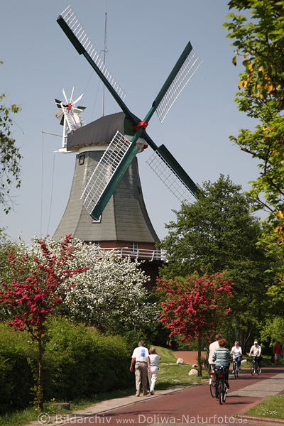 bunte Baumblüte unter einer der bekannten Zwillingswindmühlen mit Museum in Ausflug zur Nordsee Fotografie. Niedersachsen Reise an Leybucht, Urlaubsausflug Bild, Greetsieler Reiseangebot, Landschaft in Krummhörn Reisebildarchiv professionell Foto, Fremdenverkehr Attraktion