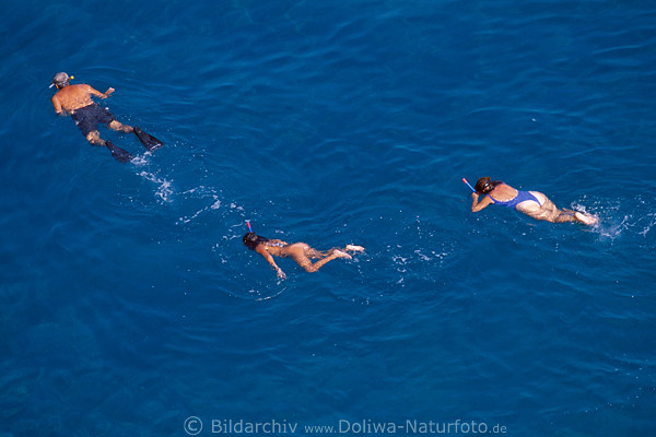 Mann Frau Mädchen Dreier Badeurlauber im See, baden im Meer Ligurien Blauwasser Fotografie schwimmen im Mittelmeer Blick nach unten von hohen Seeküste
