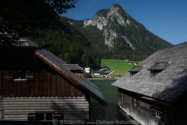914246. Grünstein Bilder Fotos über Wiese Bergblicke durch Bootshäuser im Wasser Königssee BootshafenSchönau am Königssee Hafenholzhütten sind Lager und Parkplätze der Königsseeflotte, der umweltfreundlichen Elektromotorboote, weil nur diese im Gebiet des Nationalpark Berchtesgaden fahren dürfen, damit die saubere Luft der Berglandschaft nicht verschmutzt wird |