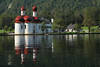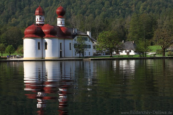 914441. Wallfahrtskirche St. Bartholomä Basilica am Ufer Königssee Wasserlandschaft FotoAlpensee Halbinsel Bartholomä berühmte rot-weiße Kirche neben Gasthaus Nationalpark Berchtesgaden Berglandschaft Naturbild Schiff-Seereise |