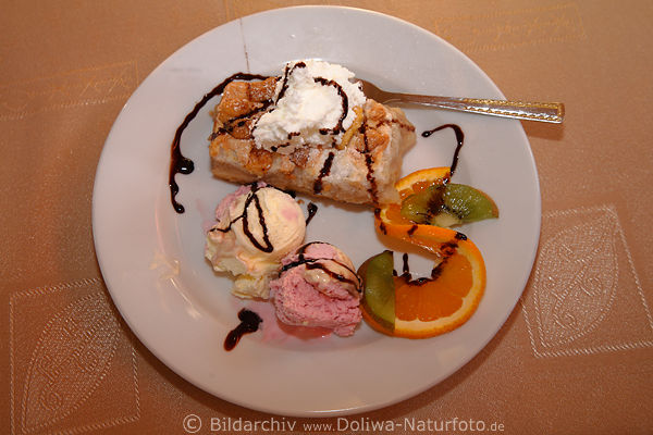 Eisdessert aus Apfelkuchen mit 2 Kugeln Eis in Bild mit Sahne, Kiwi, Orange-Scheibe garniertDessert auf weissem Teller serviert braune Tischdecke Nachtisch zum Kaffee, süsse Nachspeise Fotografie einfache Leckerei.