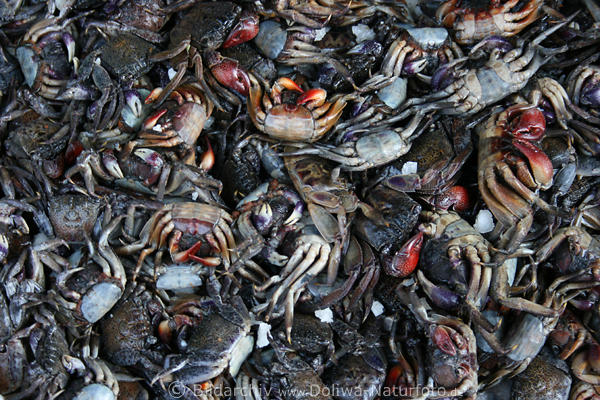 7007 Krebse und Krabben, Krebstiere Menge gefangen auf Marktstand in Bangkok, Meerfrüchte FotoFischhalle Delikatesse zum Verkaufen, Markthalle proteinreiche Frischware aus Meer Salzwasser, Meerestiere Krebsart Foto, Fischfood vom Thai-Markt tierisches Essen, Food vom See