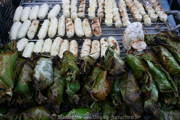 7008 Grillbananen gegrillt über Rost in Pflanzenblatt eingewickelte Bananen grillen wie Kohlrouladenauf Grillrost braten, grillen & backen, Bananenspiesse, Banane Spiess, süsse Früchte Essen