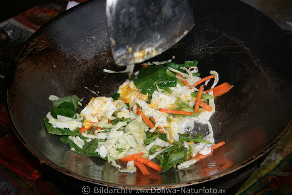 Fried vegetables from Pan, grünes Gemüse mit Ei auf Thai-art, Gericht aus der Pfanne, aus dem Wok(Kochgerät aus Thailand mit rundem Boden, gleichmässige Verteilung der Hitze) Thai-Speise in Foodfoto
