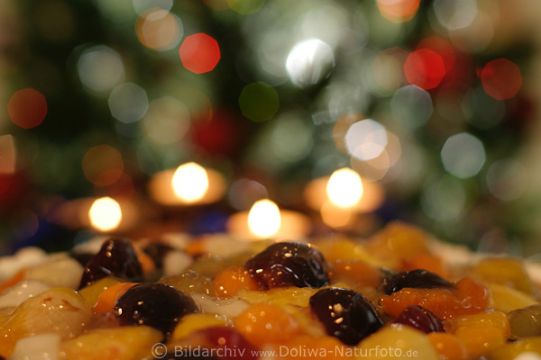 Obsttorte Foto Früchte in Gelee vor Kerzenlicht Dessertkuchen für WeihnachtsfeierFruchttorte mit Obst in Bild, Kerzen Lichter am Weihnachtsbaum, suess Essen für Weihnachtsfeier, süsse Leckereien zum Naschen, Dessert Fotografie
