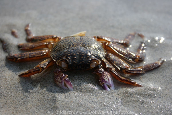 Krabbe im Strandsand Tierfoto Krebstier am Meer in Sonne krabbeln