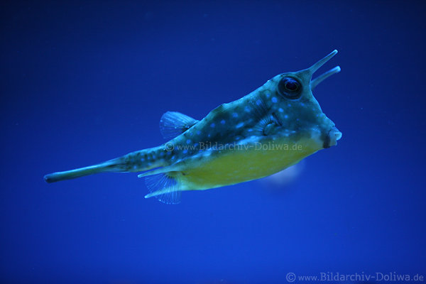 süsser Kleinmaul, Großauge in Bild schwimmend in Blauwasser Vierhorn-Kofferfisch Lactophrys aquadricornis mit bis 46 cm Körperlänge zu sehen in Ozeanarium Misdroy an der Ostseeküste oder zu erleben freilebend in Westatlantik