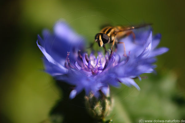 Wespenähnliche fliegende Tierchen auf Blüte in Natur, Insekt wildlife Tierfoto, Bienen & Fliegen in Makrofotografie, Schwebefliegeart an Pflanze in Lüneburger Heide Makrobild der Fauna