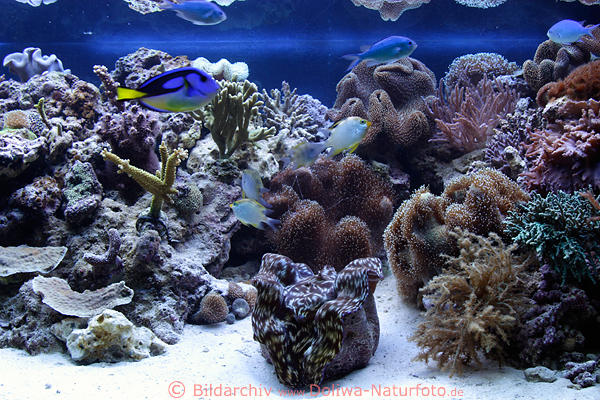 Meerestiere, Tiere mit Tentakeln in Kalkskelett als Schutz. Bunte Aquarienwelt Weichtier (Mollusca) Riesenmuschel (Tridacna derasa), Riffbarsche, Amblyglyphidodon aureus, Goldener Riffbarsch, Chromis viridis, Doktorfische, Naso elegans (Indischer Gelbklingen-Nasendoktor), Paracanthurus hepatus (Paletten Doktorfisch), Zebrasoma xanthurus (Rotmeer Doktorfisch) Tierbilder & kleine Fischchen in Tierfoto