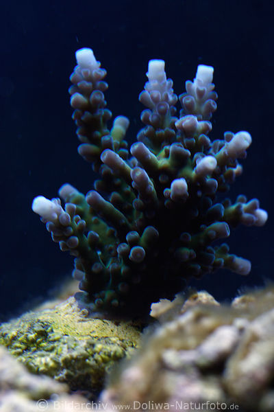 (SPS - Small Polyp Scleractinia), Acropora spec. blau, Ernährung durch Zooxanthellen / Licht. Lebewesen in Wasser, Aquarium Tierbild, Stock Tierfoto