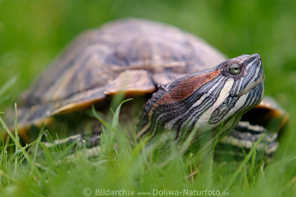 608195 Schildkröte Kopf Maul Auge in Foto Panzerschale Tierportrait in Gras Sumpfschildkröte