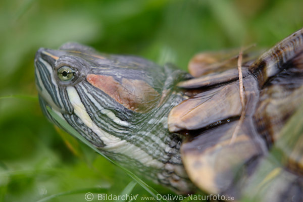 608119 Sumpfschildkröte in nassem Gras kriechen Auge Kopf vor Rückenschild aus Knochenplatten