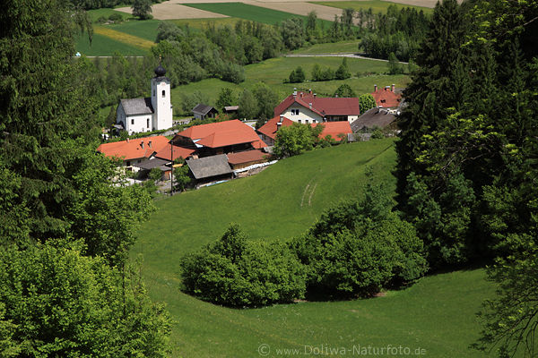 Kärnten Berge Dorfpanorama bei Greifenburg gelegen in 603 Höhenmeter inmitten grünen Bergwiesen und Bäumen unterhalb Wälder in Bild von der Bergstraße im Outdoorpark Oberdrautal, Österreich Reise in Gailtaler Alpen Bergidylle Naturaufnahmen vom Wanderparadies
