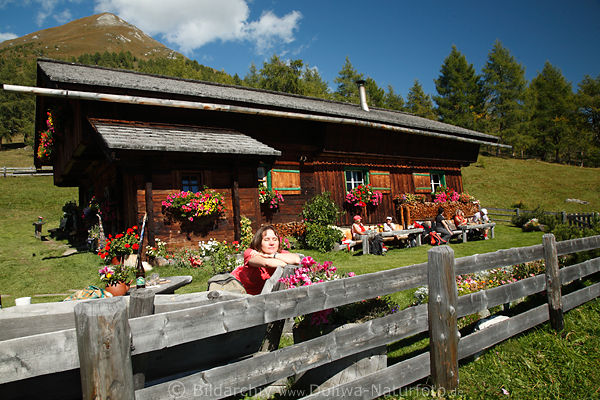 Urlauber rasten, entspannen, bäuerlich, urig, mit Blumen, schön geschmückte Berghütte, sonnig grüne Almwiese in 1948 m Höhe. Osttirol romantischer Wandertipp Jausenstation über Virgental Naturausflug, Berge Wanderparadies, grüne Oase südlicher Hang Osttirol Naturlandschaft
