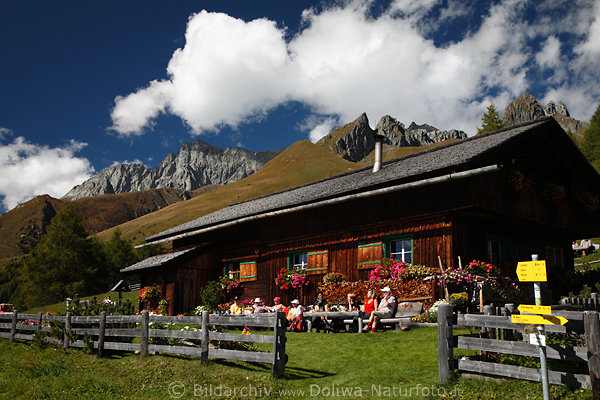 Virgental Almhütte mit schönen Blumendekoration, Wanderausflug bäuerliche Hütten-Romantik auf südlichen Berghang Bild herrlich Bergblick auf Wunspitze 3217m, wie andere Hohe Tauern Gipfel Landschaftsbild von Bergland Osttirols grüne Almoase Österreich schöner Wandertipp