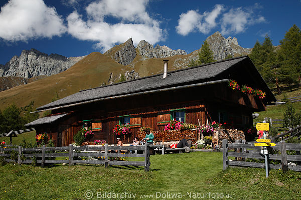 Ostalpen romantischer Wandertipp: urig, bäuerlich, blumige Hütte in 1948m Höhe ü.M. sonniger südlicher Berghang herrlicher Gipfelblick, Talsicht. Wanderparadies Hohe Tauern schöne Berge grüne Oase für Jause in Natur Alpenlandschaft Urlaubsbilder vom Almausflug über Virgen Obermauern
