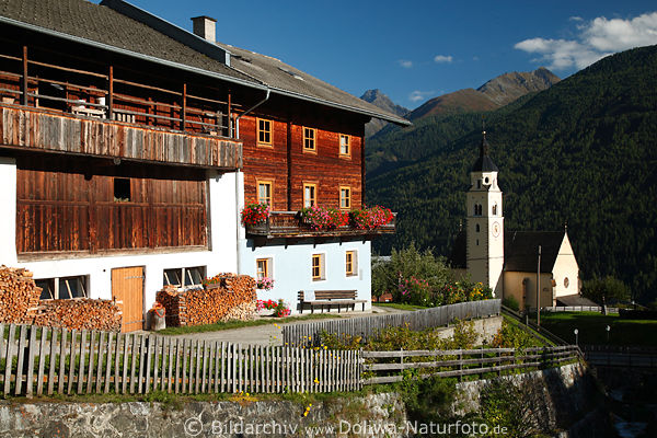 Obermauern Haushof mit Holzstapel, Holzzäune über rauschendem Bach, blumiger Balkon mit Bergblick auf Berge Grünwälder in Naturlandschaft Osttirols Fotografie Österreich Virgental sonniger Bergdorf mit Wallfahrtskirche und Landschaft wie gemalen zum Wandern