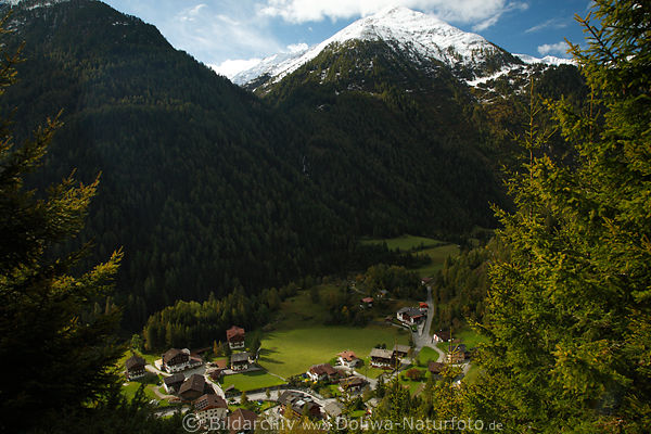 Osttirols Alpendorf unten in 1331m Seehöhe in Sicht vom Wanderweg über Ortsteil Prägraten Hinterbichl im Virgental Landschaftsfoto von grünen Berghängen in grüner Bergpanorama Blick n vor Toinigspitze mit 2666 Meter mit Schnee