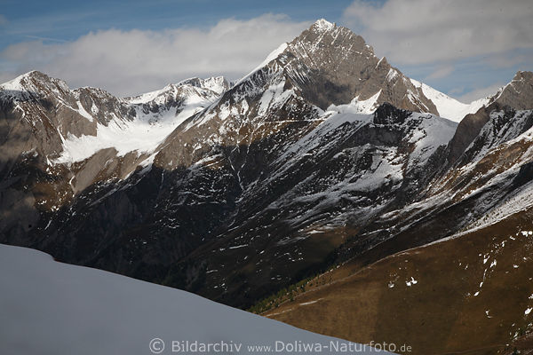 Österreich Osttirol Alpen Naturlandschaft im Nationalpark Hohe Tauern Gipfelblick über Schneekante von Wanderung auf Cimaroß im Großglockner Resort