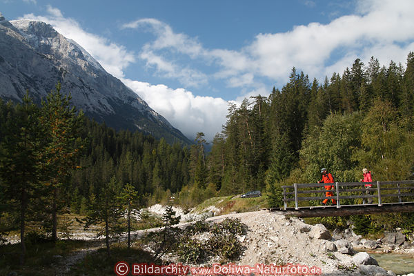 Gaistal Bergland Naturpark Foto kilometerlange Wanderwege zu Almwiesen & Viehweiden unter Berggipfeln. Start für die Wanderungen kann Leutasch-Klamm sein, oder dahinter noch ein Stück weiter oben die 5 Parkplätze hinter der Kassenschranke. Eintritt ist kostenlos, nur eine kleine Parkgebühr pro Auto wird erhoben: 4 Euro / Tag (2008). Leutasch-Touristen mit Gästepass bekommen noch 25 % Ermessigung darauf.