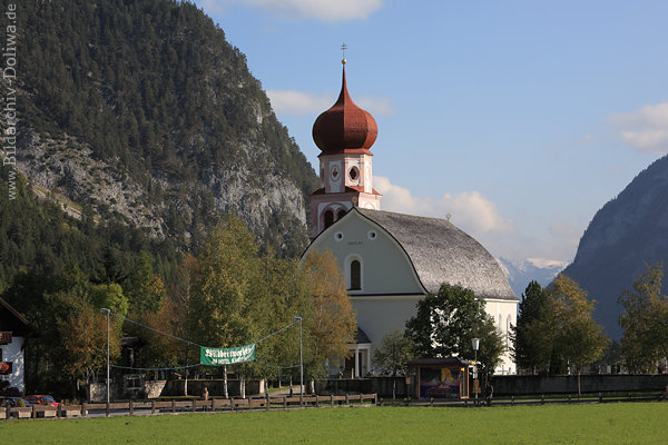 zwischen Bergen in Tiroler Ferienort im Leutaschtal auf ca. 1136 m Höhe ü. M., Tiroler Gotteshaus Fotografie, Österreich Reisebild, Impression von Alpen Bergurlaub, Nordtirols Kirchenbild in Berglandschaft