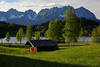 Tirol Kitzbüheler Alpen Landschaft Bergidylle Naturbilder vor Kaisergebirge Bergkulisse Gipfel Skyline über Grünwiese Aufnahmen Holzscheune Wald Bäume Naturidyll in Abendlicht Berge Österreich schöner Urlaub Wilder Kaiser Reise in Frühling Fernsicht