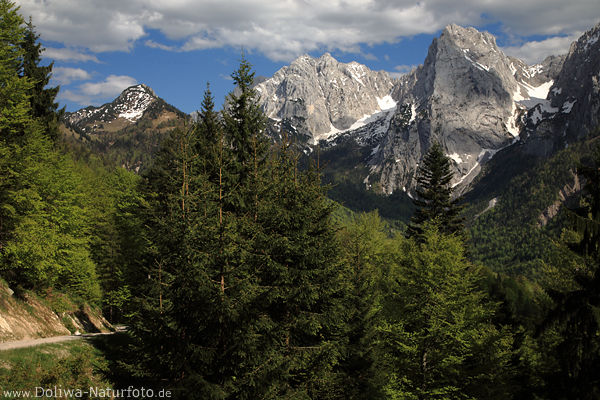 Berge schöne Wildnis gewaltige Felsen Fotografie Naturschutzgebiet Kaisergebirge felsige Alpengipfel Naturgewalt Aufnahme über Wald Grünbäume Fichten Tiroler Wanderweg von HinterkaiserAlm über Hechleit-Alm in Österreich-Alpen