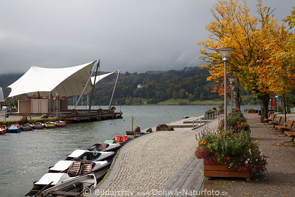812604 Alpsee Musik-Pavillon Foto am Seeufer und Boote im Hafen an Seestrasse Herbstbild Allgäu ReiseAllgäus größter Natursee Grosser Alpsee Seeufer am Fluss, Landschaft Fotografie mit herbstlichen Bäumen in Ortsteil Bühl am Alpsee, Bayern Ferien nord-westlich Immenstadt im Allgäu, Badesee im Bergland, Bergsee Seelandschaft |