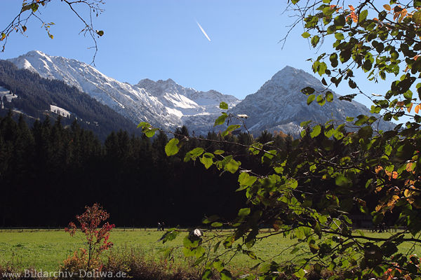 812746 Allgäuer Alpen Gipfelblick Foto aus Fischen durch Blätter über grüne Wiese auf Berge in SchneeOberallgäu Bergblick Naturfoto in Herbst, Allgäu Alpgipfel Bild über Illertal verschneit in Fotografie Bayern Berglandschaftblick vom Bergdorf