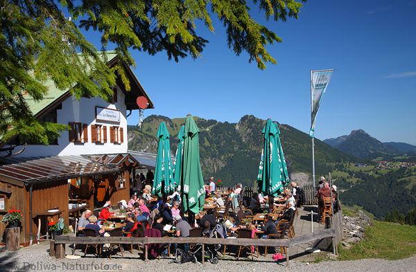 212587. Allgäu Hornalpe Berge Gasthaus-Terrasse Besucher Gipfel Sicht bis Oberjoch NaturfotoAlpenlandschaft-Bildarchiv Oberallgäu Reiseführer Wanderurlaub schöne Einkehr-Station Berggasthof “Zum Oberen Horn” Naturidylle unterhalb Imberger Horn liegt direkt an der Hornbergbahn in 1320 m Lufthöhe über Bad Hindelang mit fantastischem Alpenblick Bavaria travel photo |