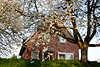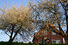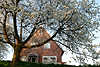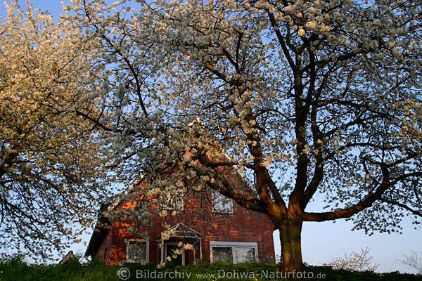 Kirschbäume, Wohnhaus hinter Kirschbaum im Sonnenschein