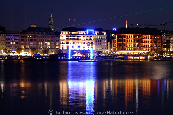 nachts in ganzer Stadt, hier Alster- & Citypanorama, Michel Kirchturm sendet Leserstrahlen, Häuser der Innenstadt & Stimmung abends an Hamburger Binnenalster täglich während der Fussballweltmeisterschaft, WM-Fanmeile für Besucher & Touristen der Stadt, Freizeit & Shoping Zentrum der Hansestadt, Seeufer mitten in Großstadt, Alstersee