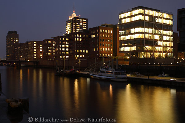 Hamburg Sandtorkai Hafencity Häuser Nachtlichter Fotos auf Brookinsel mit Hanseatic Trade Center Turm