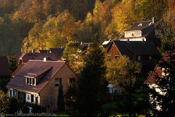 Harzgebirge Buntfarben im Harzer Wald, Hausdächer im Herbstwald Naturfoto in Deutschland Reisebild vom Urlaub Ausflug