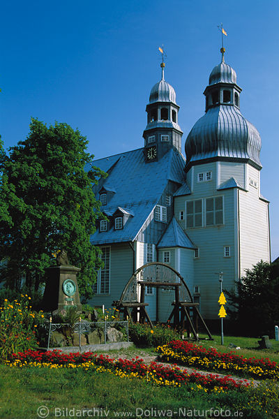 Alte Holzkirche in Parkanlage mit Blumen in Harzer Stadtzentrum Reiseansicht. Clausthal-Zellerfeld Reise in Harz Bergstadt, Niedesachsen Urlaubsort im Harzgebirge Reisetip
