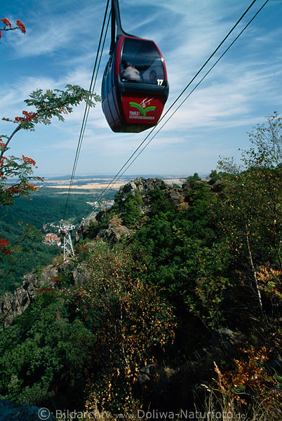 Ausflug in Bergbahnkabine Wagon über Harzer Schlucht Bodetal zum Hexentanzplatz, Attraktion im Harzurlaub, Seilbahnlift Kabinenbahn Reisebild