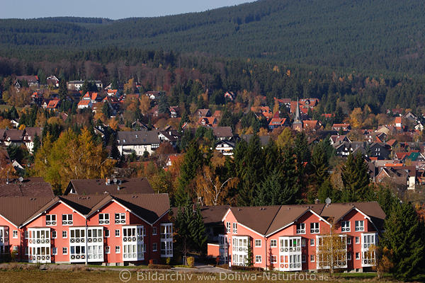 Harzer Urlaubsort bunte Herbst Ausflug Reise in Bergland herbstliche Farben von Stadtzentrum mit Kirchturmblick