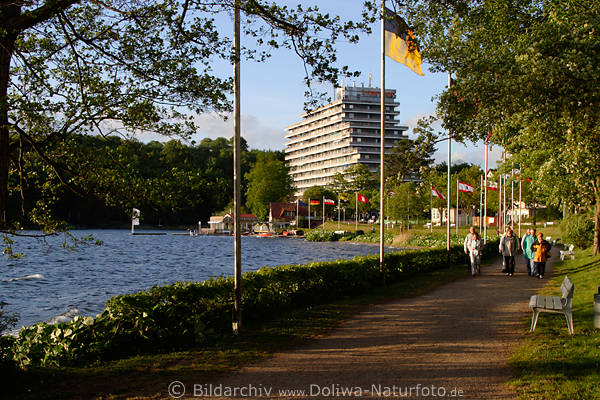 Holsteinische Schweiz Reisebild, Reisefoto, Hotel Intermar mit Restaurant direkt am Seewasser, Promenade mit Menschen spazieren in Urlaubsort & Urlaubsziel in Schleswig-Holstein