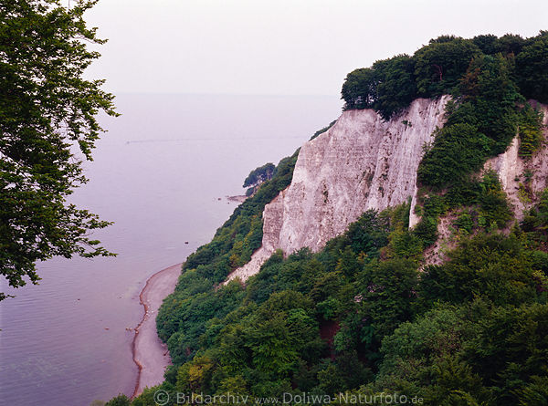 Ostseeküste mit Kieselstrand unter Hochufer, 110 m hoher Ufer mit Wald, Kreidefelsen Ausflugsziel, Motorboot aus See