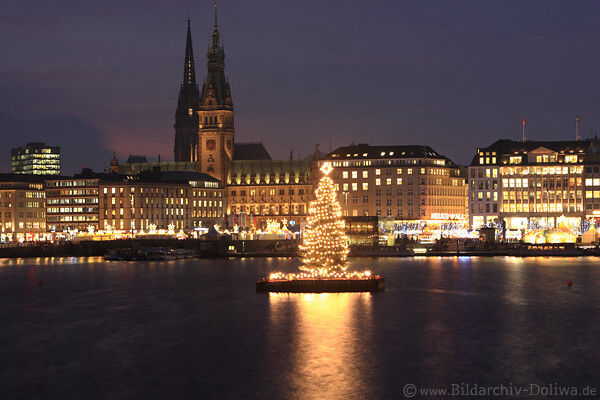 Alstersee-Weihnachtsbaum Nachtbild leuchtende Innenstadt Weihnachten romantische Nachtstimmung am Binnenalster Advent2019 Nachtfoto Hamburger Jungfernstieg Weihnachtsmarkt-Lichter Fotografie Christbaum in Wasserlandschaft Rathausturm mit Kirchturm images