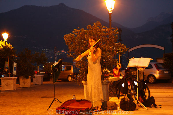 romantisches Laternenlicht mit Bergblick Geige Spielerin Porträt bei Musikunterhaltung, Violine live Interpretation in Urlaubsparadies Italiens Alpen Como-See Wärme am Wasser, nächtliche blaue Stunde