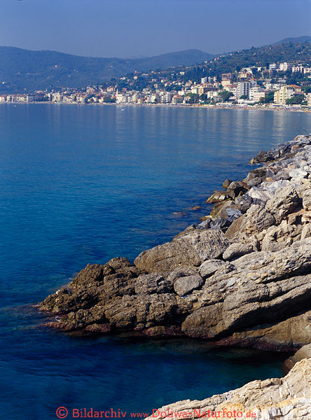 Italien blaues Wasser in Bucht am Mittelmeer, rundum Berge, Sonnenschein am Strand italienischen Riviera Urlaub in Meeresbucht See Küstebild Stadtblick felsiger Ufer Riviera di Ponente Landschaft Fotografie, Mar Ligure